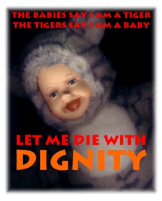 This Tigerbaby doll was found in January, and bought through impulsive horror for 4 pounds. Clearly there hadn't been enough really common people in "The Discovery Store" over Christmas. To my horror, I heard one woman say that "it's the expressions, isn't it - that's what makes them special...", and it was a masterpiece of self-control that stopped me throwing the whole display at her. To be fair, however, the shop assistant did eye the creatures with what I judged to be suspicion and fear. |
