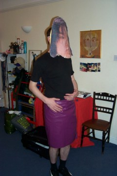 I tried on my sexiest outfit first. The purple skirt cost me over ten pounds; it is made out of this fabric that makes my legs feel all itchy and charges my pubic hair with electricity! When I take the skirt off at the end of a night of dancing, my pubicles are so bristling with power that little sparks come off them, and I can pull balloons off the wall! Tee hee! I can't believe I told you that! It's a good job that Sandy is still in the kitchen, making the tea! The internet is so rude. Black T-Shirt